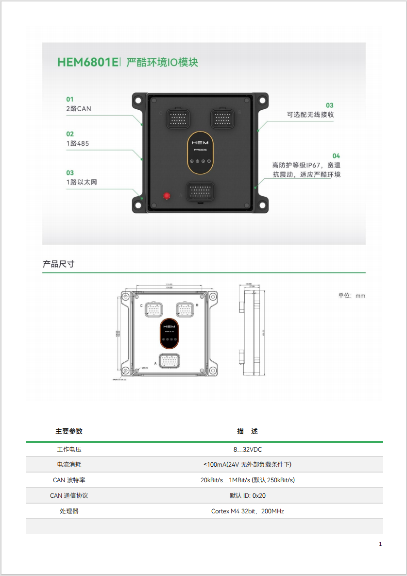 HEM6801E严酷环境IO模块具有2路CAN,1路485,1路以太网,可选配无线接收,高防护等级IP67,宽温抗震动,适应严酷环境,是一款能够满足客户不同需求的严酷环境应用产品,在工业自动化、远程监控、环境监测等领域具有广泛的应用前景。