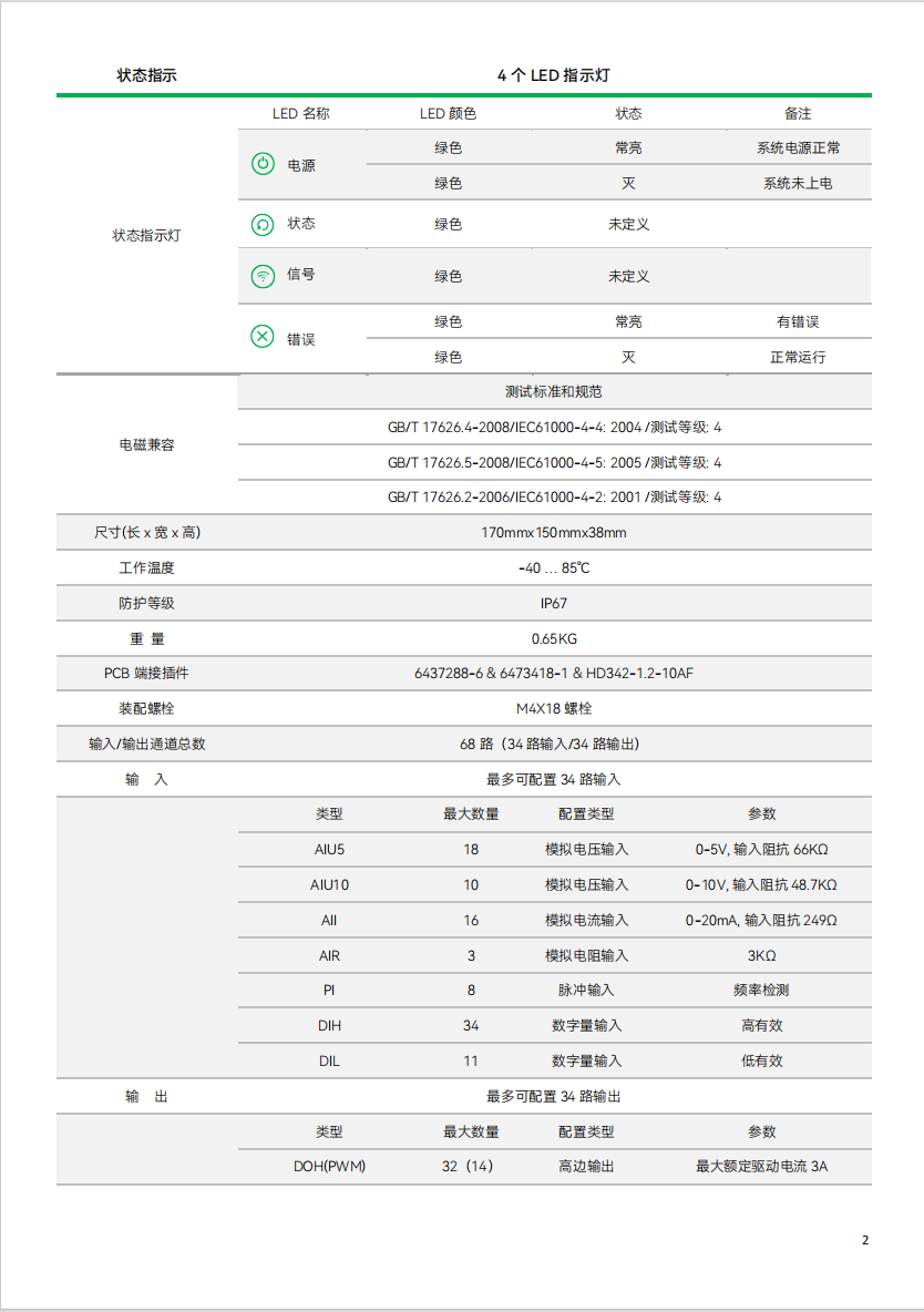 电磁兼容性,符合GB/T 17626.4-2008/IEC61000-4-4:2004、GB/T 17626.5-2008/IEC61000-4-5:2005和GB/T 17626.2-2006/IEC61000-4-2:2001等电磁兼容性测试标准和规范,测试等级均为4,确保在电磁干扰环境下仍能稳定工作。 坚固耐用:模块尺寸为170mmx150mmx38mm,重量为0.65KG,采用M4X18螺栓装配,确保结构稳固。